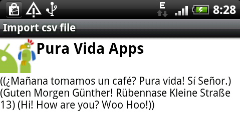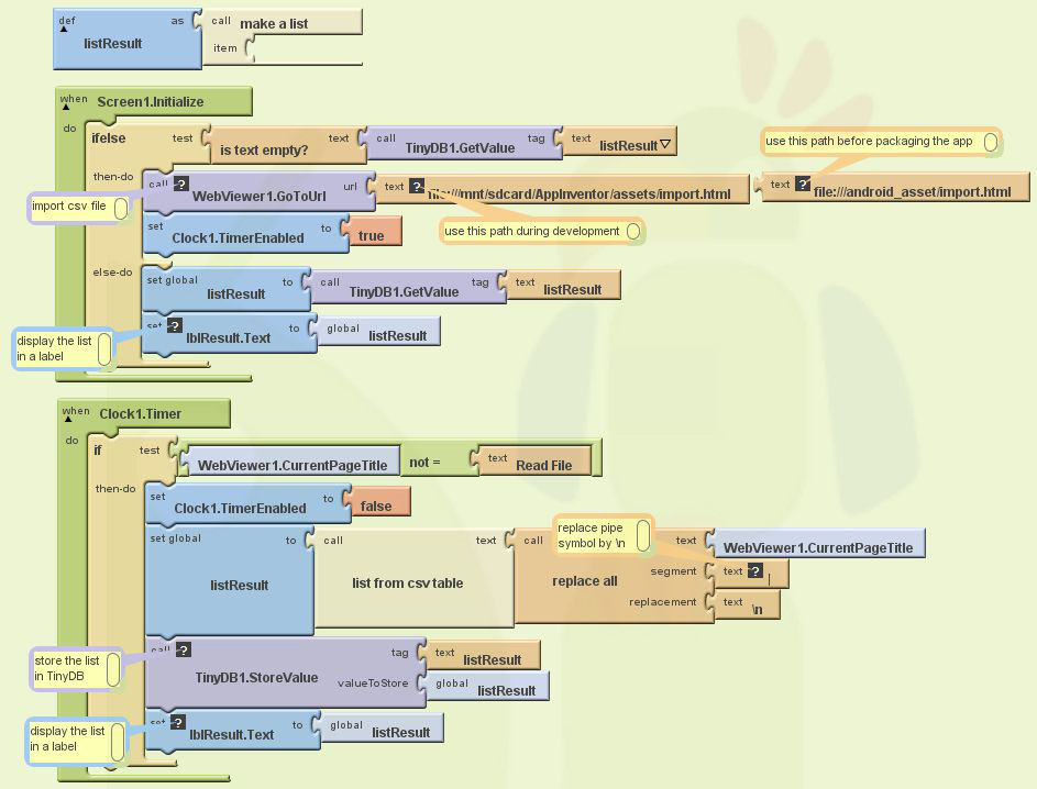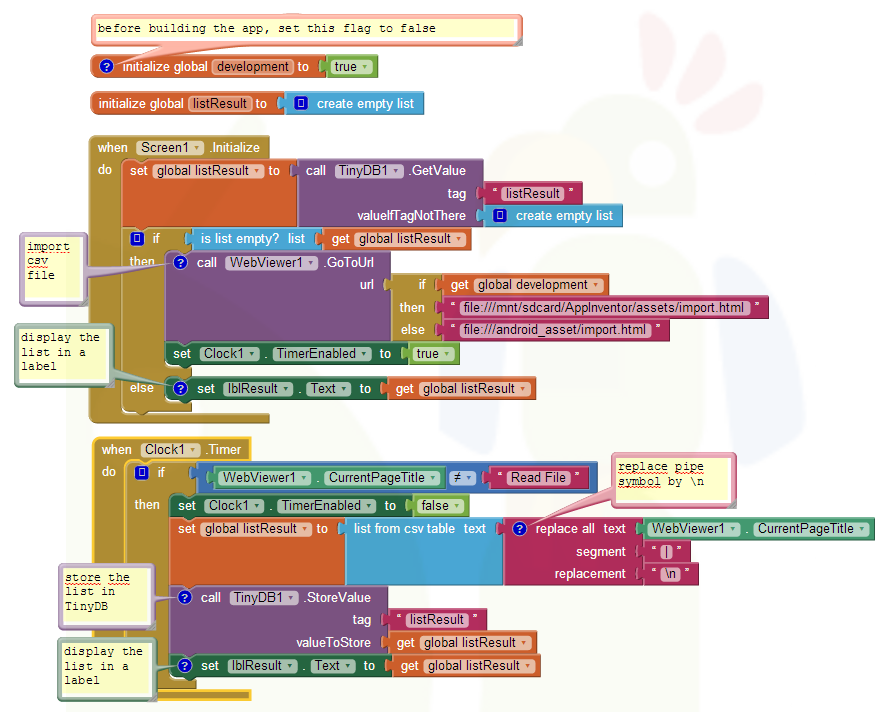 The example imports a multiline csv file stored as asset in App Inventor on first run of the app and stores it as list of lists in TinyDB. This solution also can import characters having accents etc., the following example csv file is used: