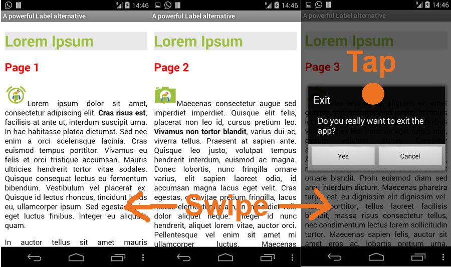 a swipe left shows the next page, a swipe right shows the previous page and tap displays a notifier.