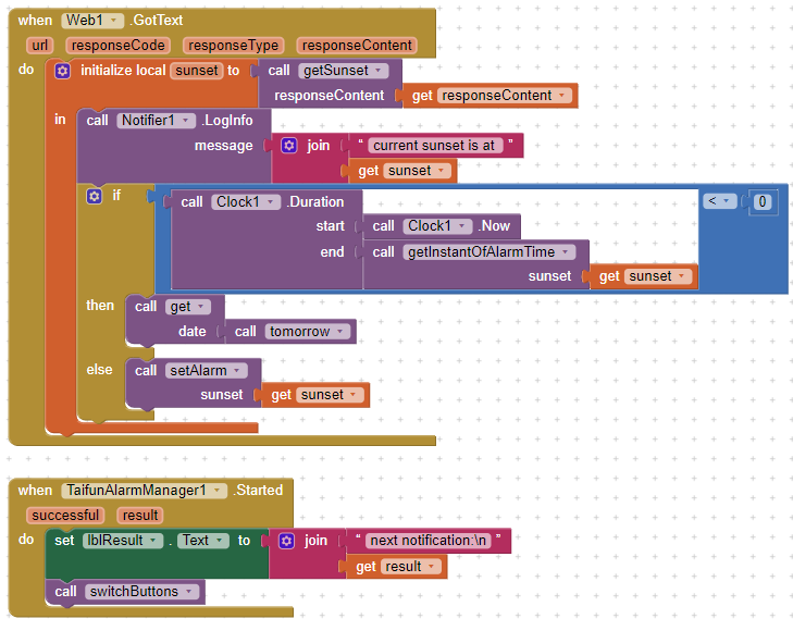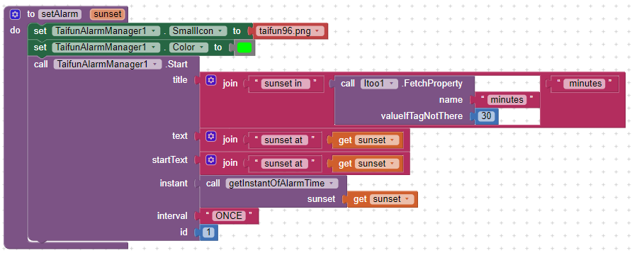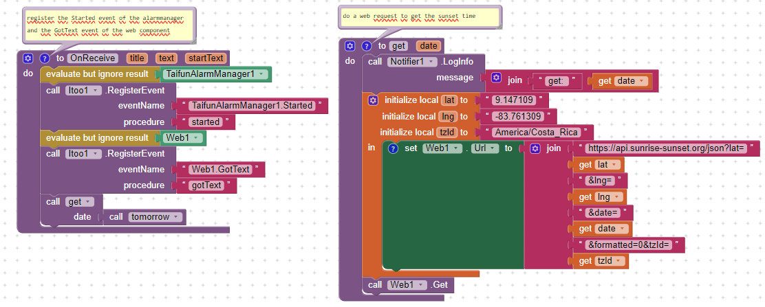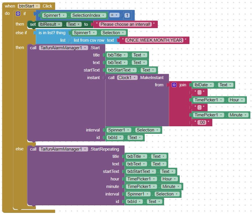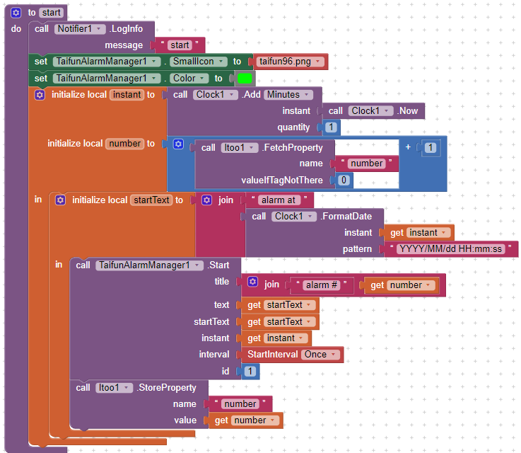 Example blocks about how to use the alarmmanager extension together with Itoo
