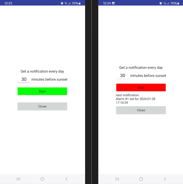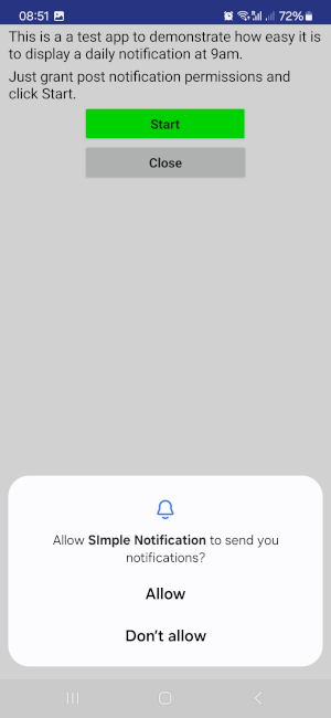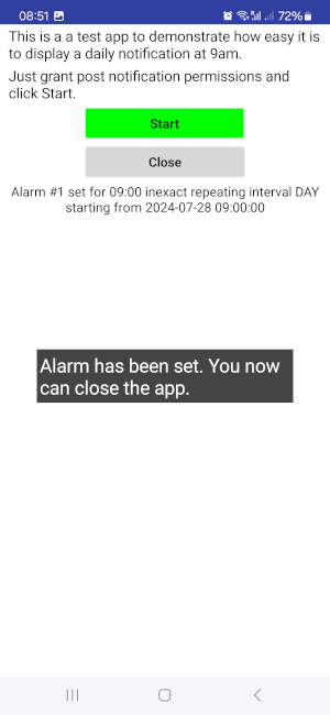 If you decide to use exact alarms, then the user needs to grant the SCHEDULE_EXACT_ALARM permission, see method AskForScheduleExactAlarmPermission below.