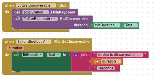 Set device as discoverable. Duration is in seconds. The maximum duration is capped at 300 seconds for each request.