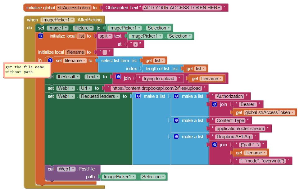 Download Dropbox project (aia file) to test with your access token and your Dropbox