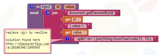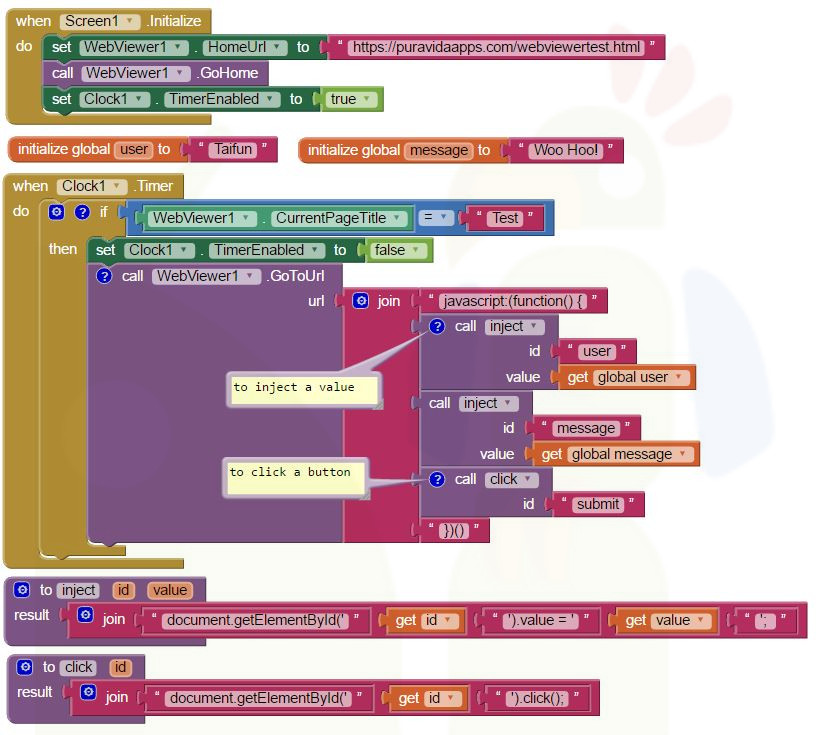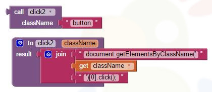 How to fill out a form of a webpage and click a button using some JavaScriptIt hase been asked in the forum: How to automatically fill fields in a web page's form (when loaded in a webview)? and How to click a button? We can do it using some JavaScript, see the blocks below. Thank you Stefan for your snippet.