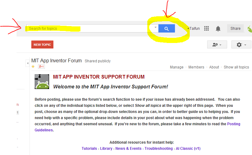 Doing a Search is very easy, just go to the MIT App Inventor Forum, enter a search topic in the Search box and click Search.