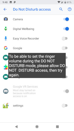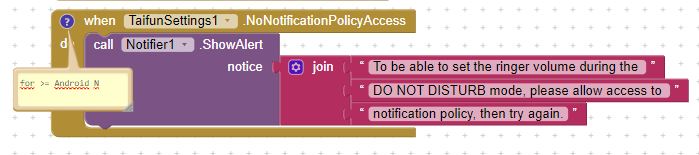 Feb 13, 2019: Version 7a: to be able to set the volume of the Ringtone for >= Android N during DO NOT DISTURB mode: the permission ACCESS_NOTIFICATION_POLICY is required. Therefore the new method HaveNotificationPolicyAccess and the event NoNotificationPolicyAccess have been added into the paid version