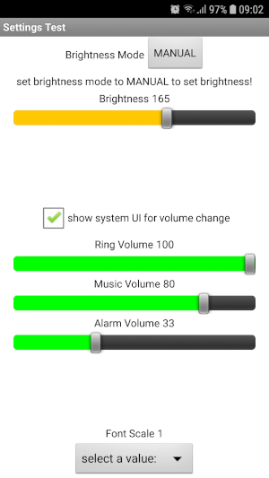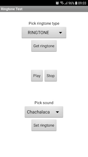 The settings test app as well as the ringtone test app are available in Google Play. You can test the examples following these steps