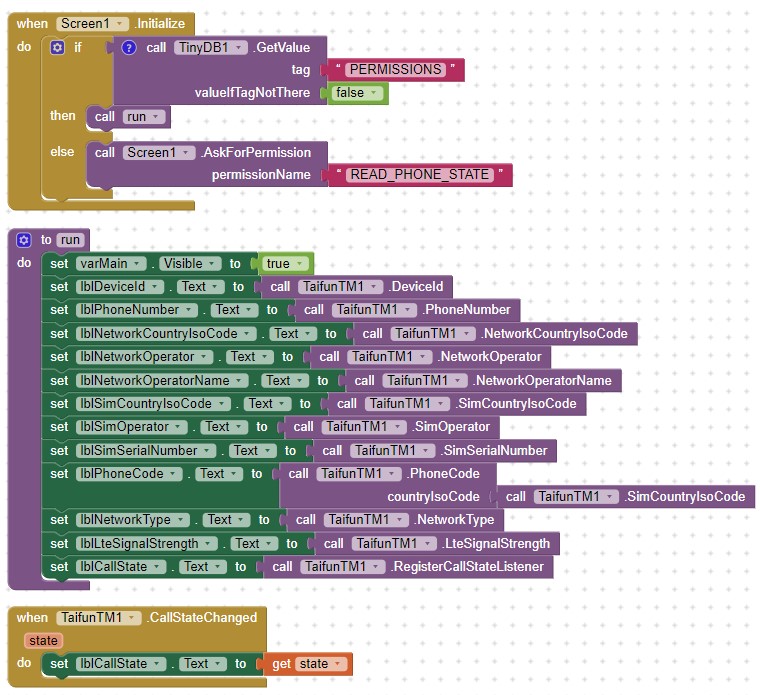 Jul 26th, 2019: Version 6: SignalStrengthChanged, SignalStrengthDbm and SignalStrengthAsu now work also for WCDMA, CDMA and LTE, however these blocks now needs permission android.permission.ACCESS_COARSE_LOCATION. New method Network Type and new methods to start and stop Signal Strength Listener added